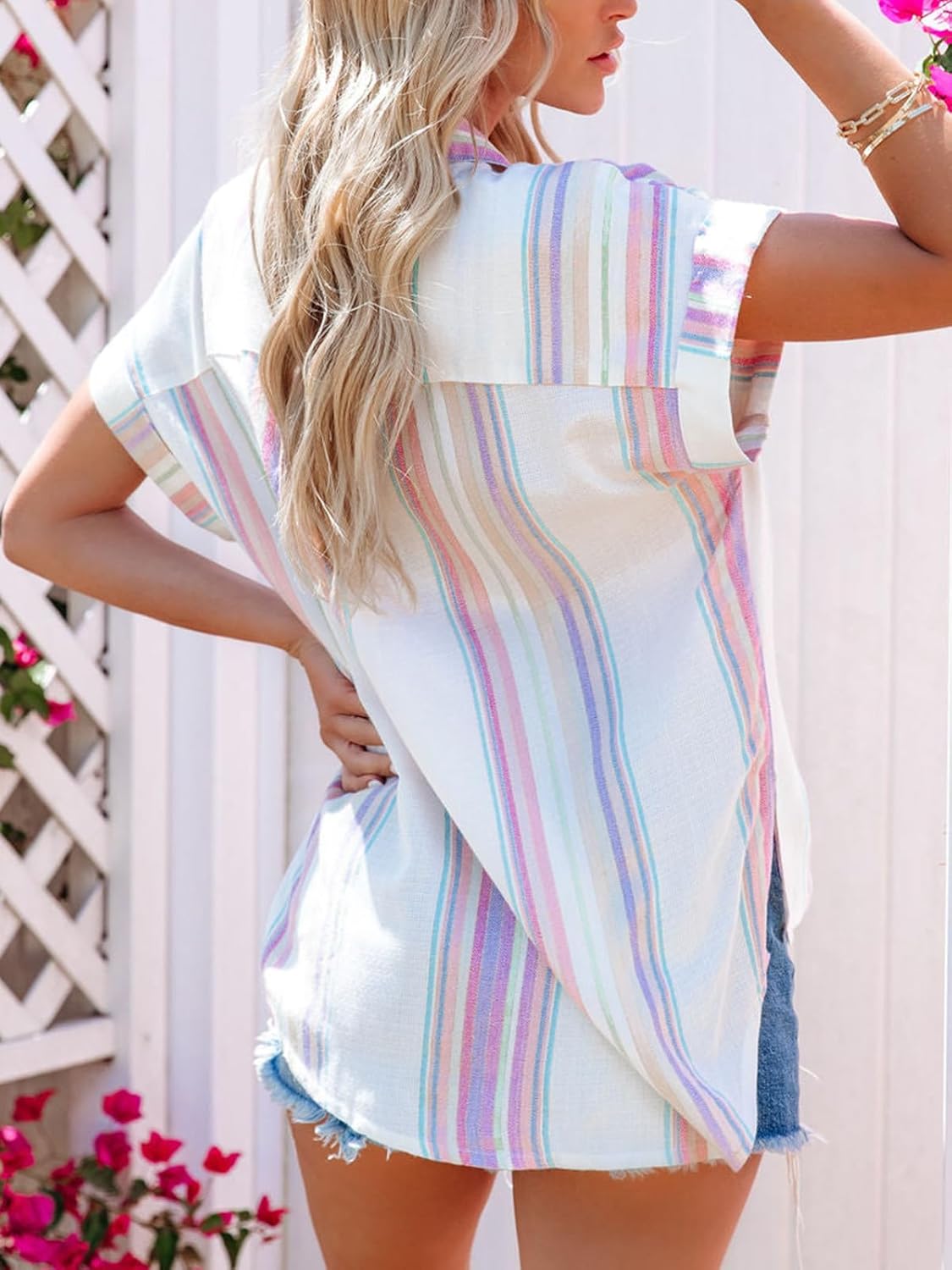 Features:Short sleeve linen shirts, womens summer tops, button down striped shirt women,v neck collared shirt, button up women, Multiple color stripes,front chest pocket, oversized boyfriend loose fit tops